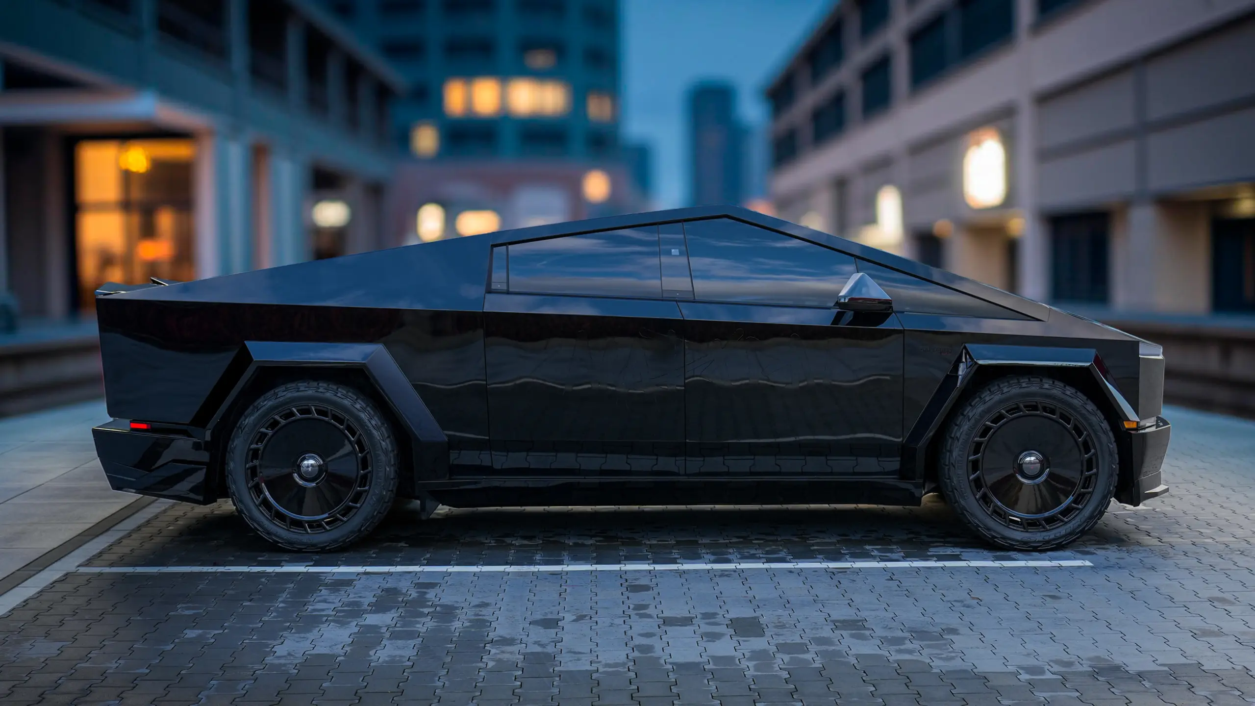 These wide fender flares and body extensions don’t change Tesla’s iconic shape — they continue and enhance it. Sharpened angles, seamless integration, and added bulk give the Cybertruck a more muscular and planted stance. Every piece flows naturally from the original design, reinforcing the truck’s alien, armored look.