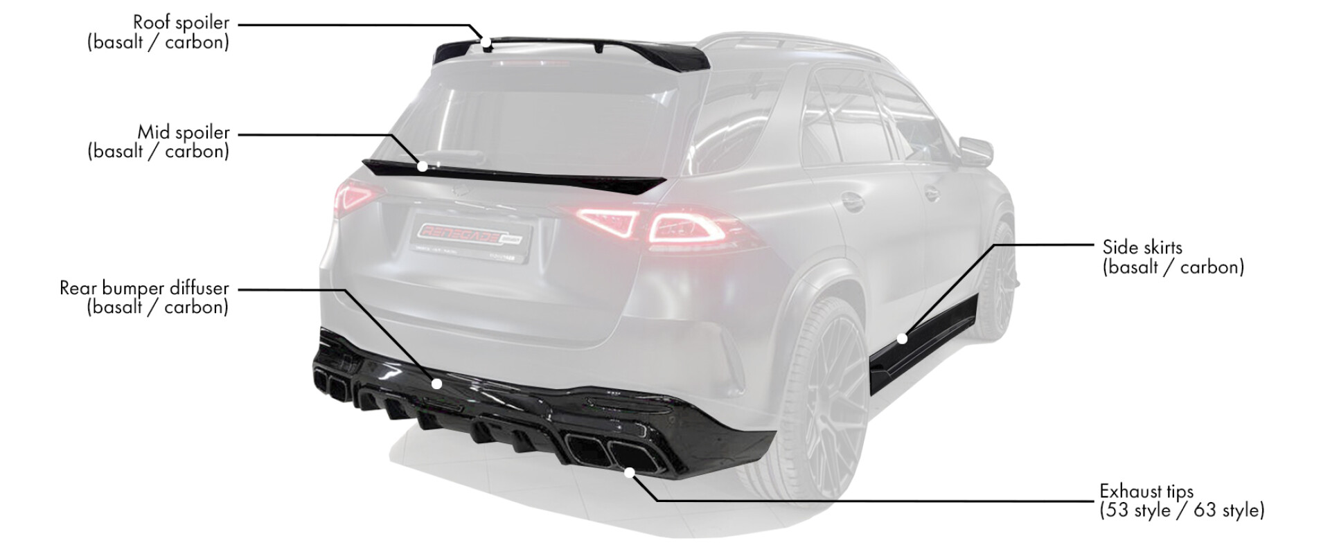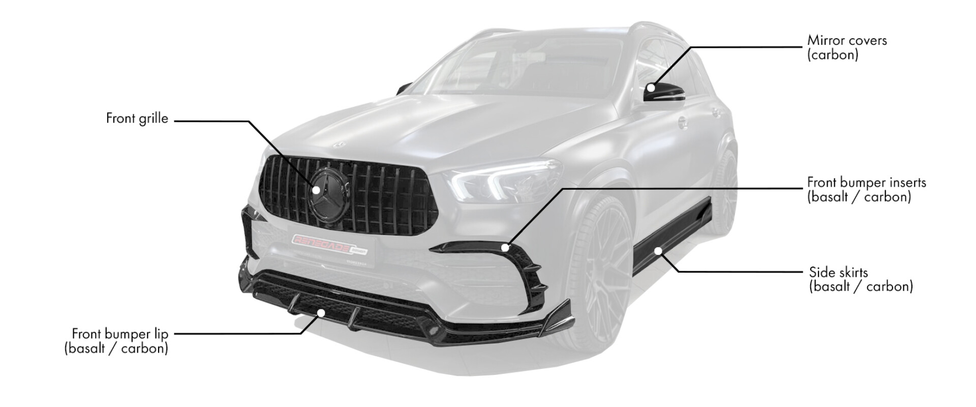 We offer premier GLE 2020 tuning using body kits made of eco-friendly basalt or sports carbon fiber — both light, durable, and celebrated in the luxury segment. Unlike basalt, carbon fiber offers a distinct texture and color, highlighting the sports-car spirit of your tuned GLE SUV. Alternatively, basalt offers robustness, durability, and enhanced resistance to impacts and chemicals.