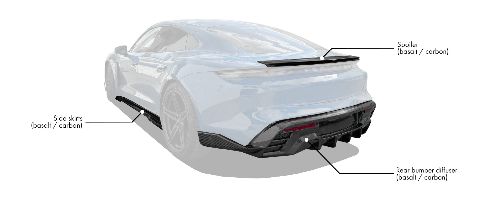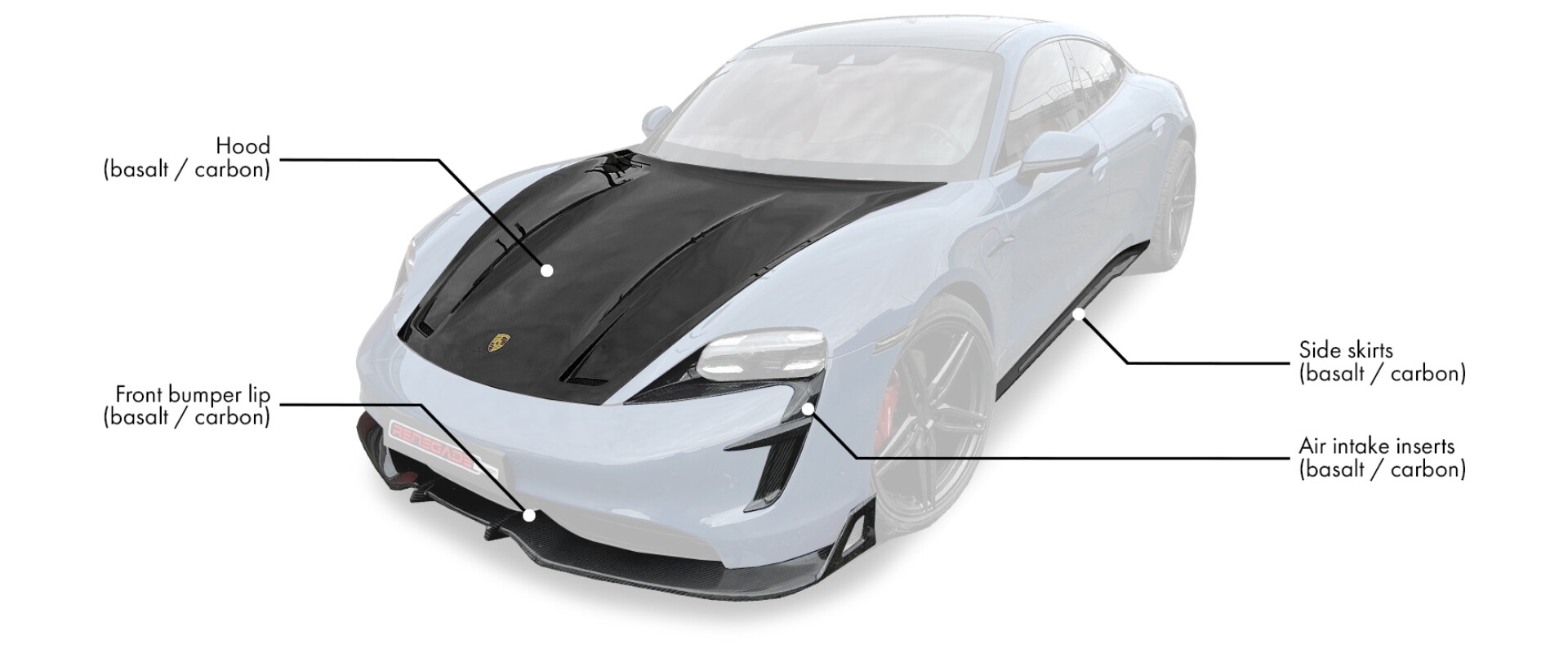 A Porche Taycan body kit is a set of alternative car parts made of basalt, fiberglass, or carbon. The kit may include several or one car parts modified according to safety rules. Typically, the set of vehicle parts includes the following items: