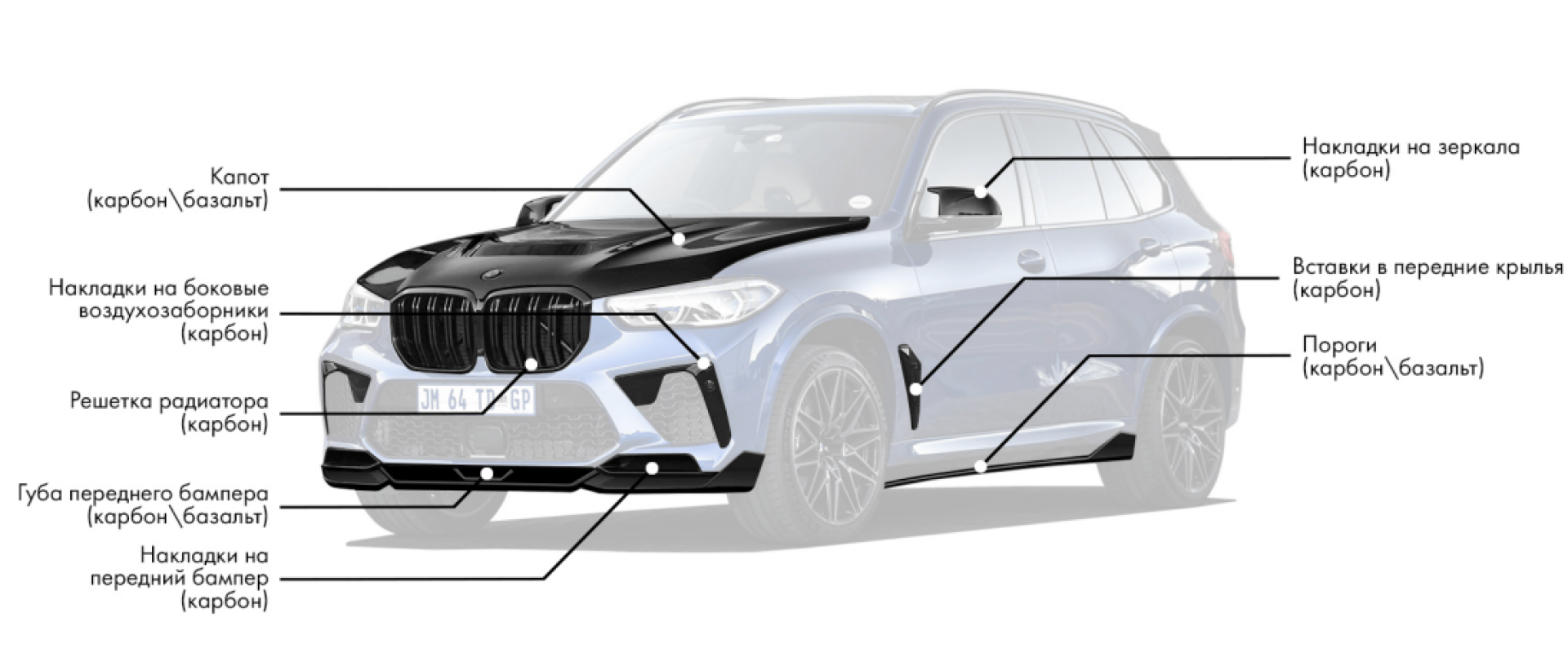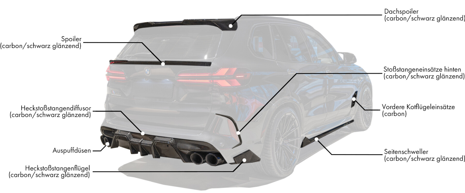 Das Tuning des BMW X5 F95 beinhaltet die Installation folgender Elemente: