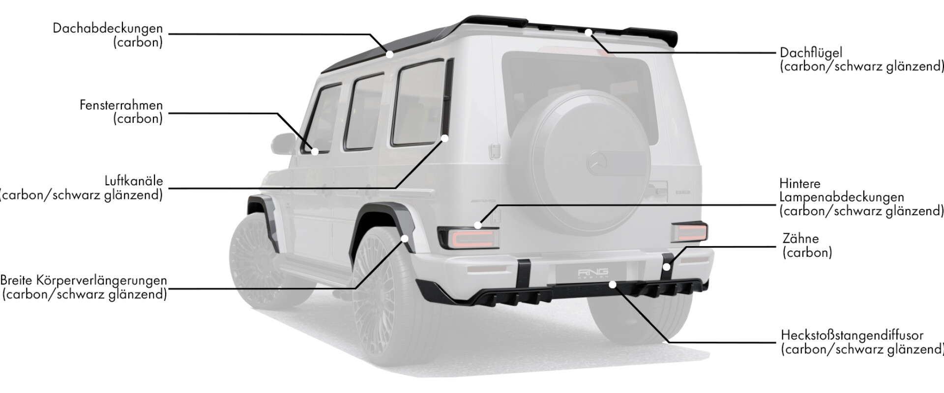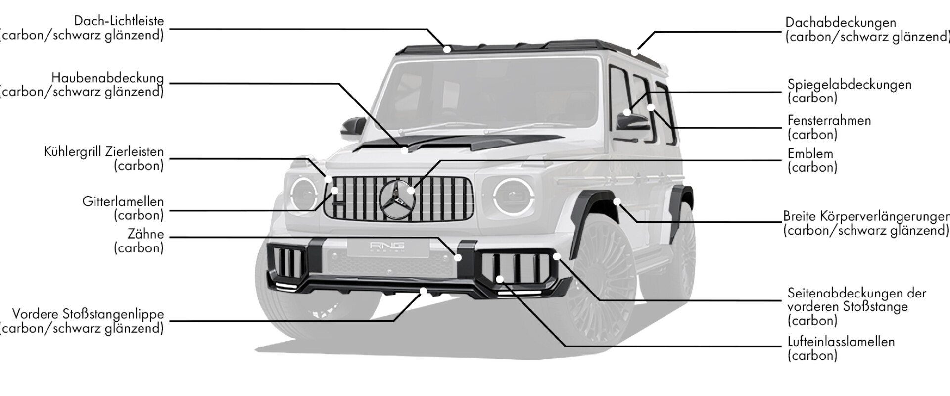 Wenn Sie sich für den Body Kit von Renegade Design für Ihren Mercedes-Benz G63 2025 entscheiden, bedeutet das, dass Sie sich für unvergleichlichen Stil, Innovation und Leistung entschieden haben. Dieses Upgrade steigert nicht nur die Ästhetik Ihres G63, sondern verbessert auch seine aerodynamischen Fähigkeiten und setzt damit einen neuen Standard für die Individualisierung von Luxus-SUVs. Steigern Sie Ihr Fahrerlebnis und heben Sie sich mit einem Fahrzeug ab, das sowohl Leistung als auch Eleganz widerspiegelt. Rüsten Sie Ihren G63 mit Renegade Design auf und erleben Sie das Nonplusultra an Luxus und Leistung.