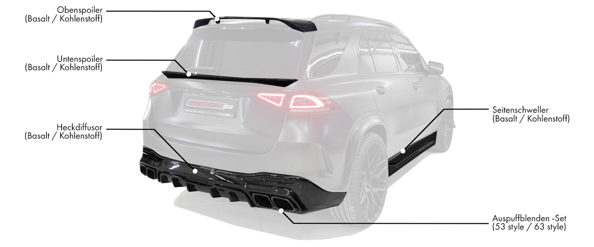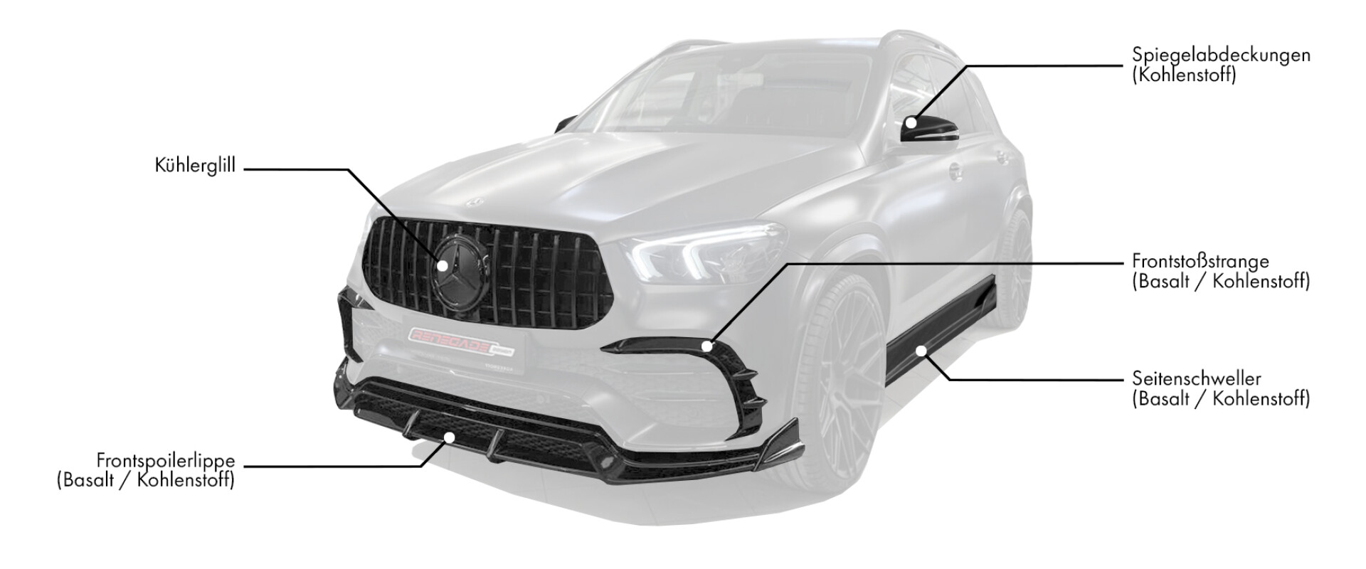 Wir bieten erstklassiges GLE 2020-Tuning mit Bodykits aus umweltfreundlichem Basalt oder sportlicher Carbonfaser – beide sind leicht, langlebig und im Luxussegment beliebt. Im Gegensatz zu Basalt bietet Carbonfaser eine einzigartige Textur und Farbe und unterstreicht so den Sportwagencharakter Ihres getunten GLE SUV. Basalt hingegen bietet Robustheit, Langlebigkeit und erhöhte Beständigkeit gegen Stöße und Chemikalien.
