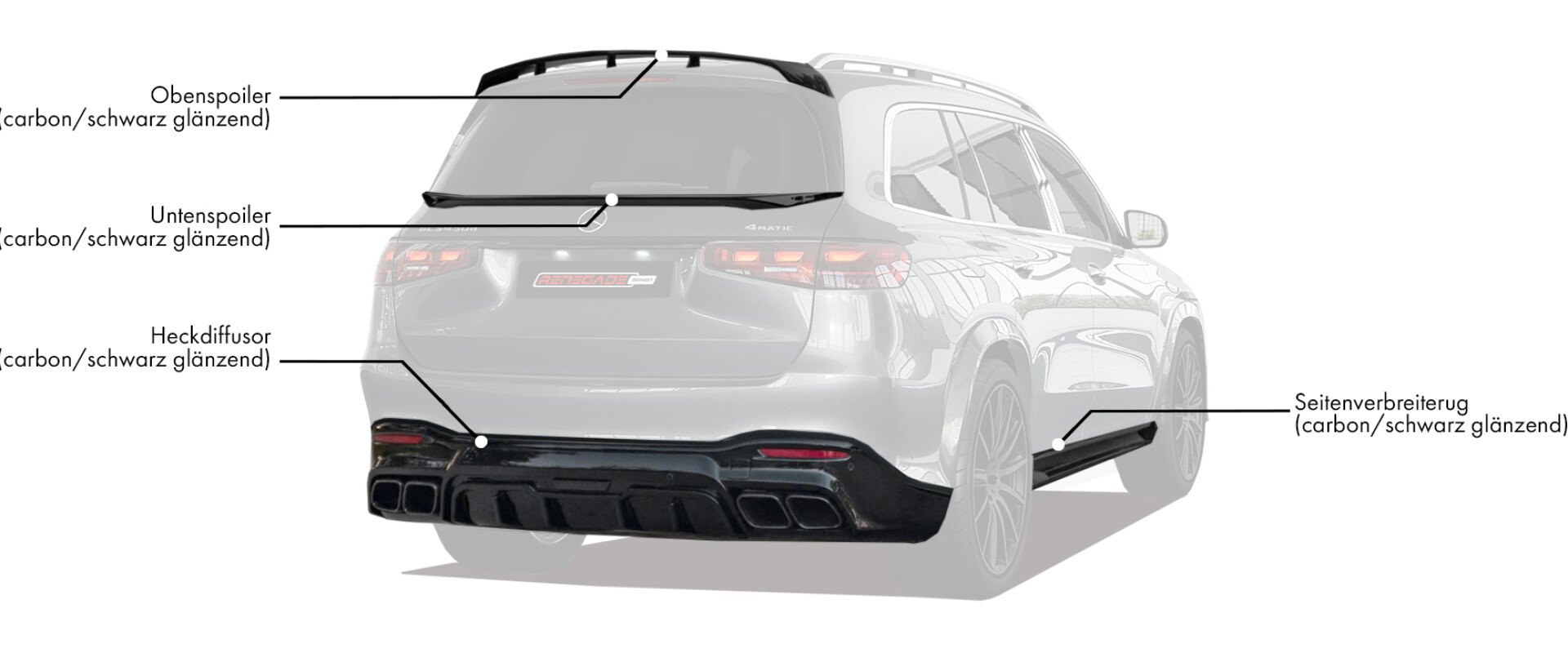 Der Body Kit ist nicht nur ein optischer Leckerbissen, sondern verbessert auch das aerodynamische Profil Ihres Mercedes-Benz GLS 2024. Durch die Reduzierung des Luftwiderstands und die Umlenkung des Luftstroms werden die Stabilität und die Effizienz des Fahrzeugs verbessert, insbesondere bei hohen Geschwindigkeiten. Dieses Upgrade führt zu einem dynamischeren Fahrerlebnis, so dass Sie das volle Leistungspotenzial Ihres GLS ausschöpfen können.